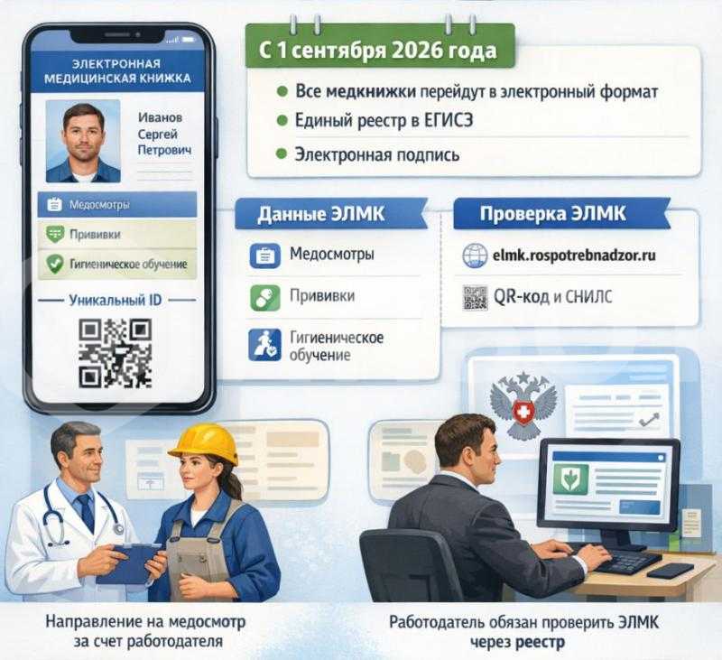 С 1 сентября 2026 года электронные личные медицинские книжки (ЭЛМК) станут обязательными для всех российских организаций и индивидуальных предпринимателей, где требуется использование санитарных книжек. Это закреплено в приказе Минздрава России от 30.07.2025 г. № 457н «О внесении изменения в приказ Министерства здравоохранения Российской Федерации от 18 февраля 2022 г. № 90н «Об утверждении формы, порядка ведения отчетности, учета и выдачи работникам личных медицинских книжек, в том числе в форме электронного документа».